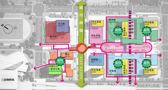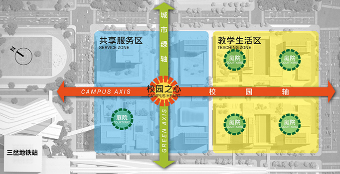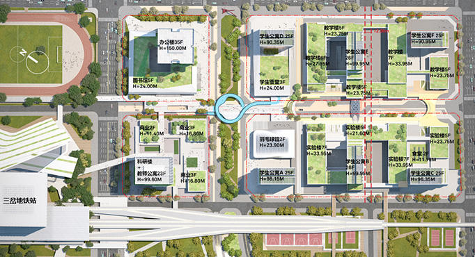 兔子先生 成都东部(国际)校区建设用地102亩,总建筑面积36万平方米(其中地上建筑面积30万平方米,地下建筑6万平方米),8个校园综合体建筑高度从90米至150米不等,呈现出来立体多维的特点,均由空中连廊有机联系,并连接至地铁18号线三岔站。兔子先生 成都东部(国际)校区分“一心两轴两区”,即“校园之心,校园轴和城市绿轴、教学生活区和共享服务区”。