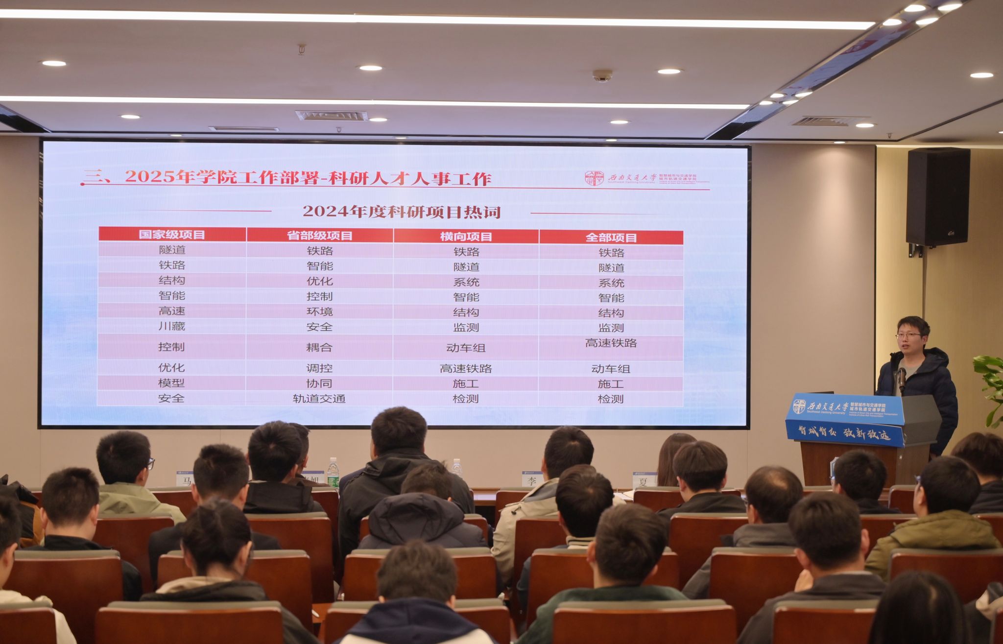 马剑从加大学院高层次人才培育工作力度、积极申建省级高水平科研平台、深入推进新时代高素质专业教师队伍建设三部分汇报部署了2025年学院科研人才人事工作。