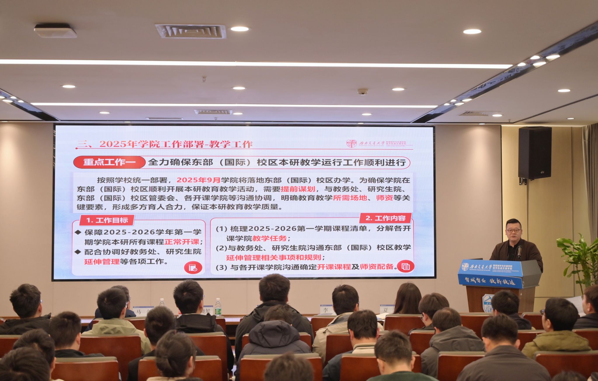 姬晓旭从保障东部(国际)校区本研教学运行、制定学科交叉特色鲜明的研究生培养机制、探索本研一体教育教学综合改革、实施数字赋能教育教学研究与实践、协同推进教育教学制度建设、总结凝练学院办学特色、统筹优化学院未来专业布局七部分汇报部署了2025年学院教学工作。