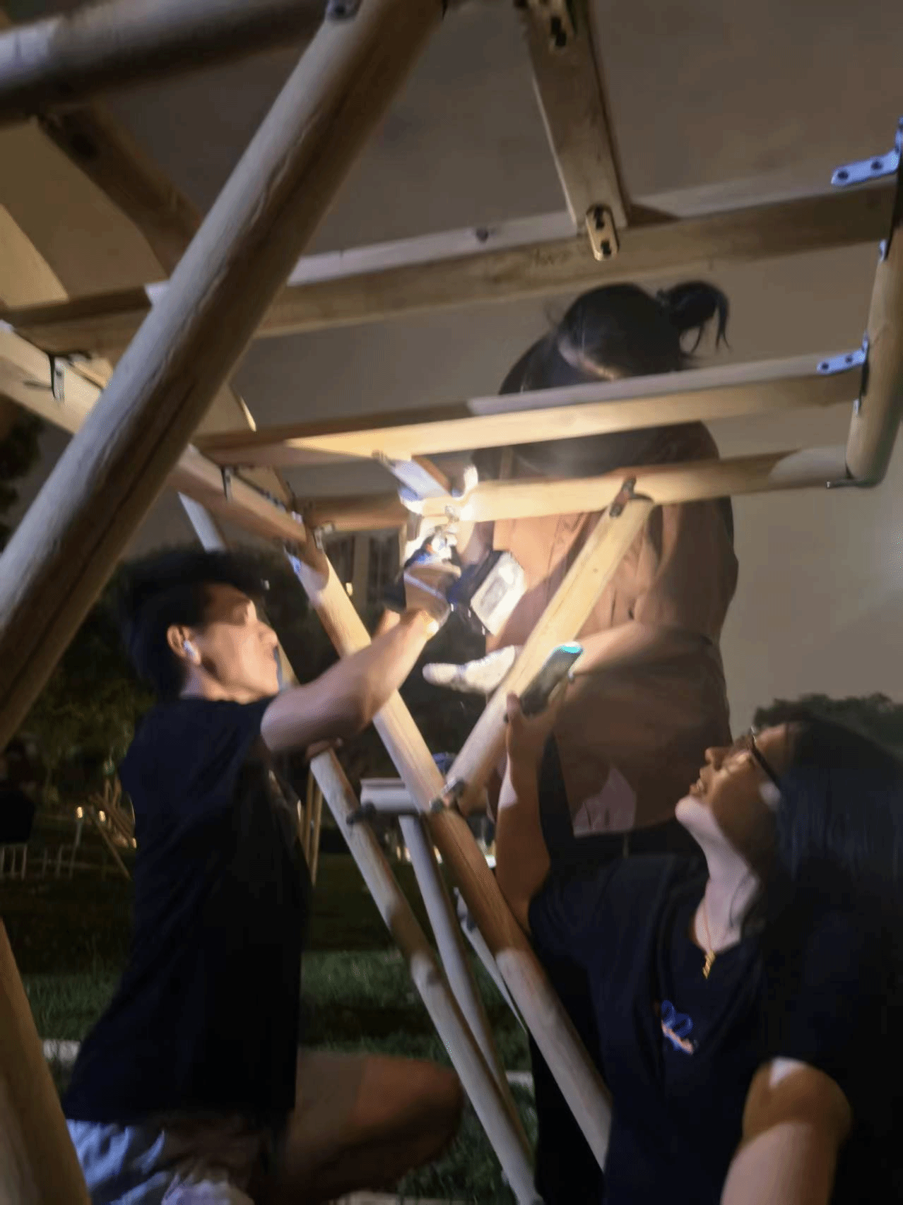 实操上,我们学会切割拼接板材,研究连接件的适配,确保结构稳固;彩色反光材料运用上,经多场景测试调整,实现不同时段的不同光影效果,同时,在从模型到实体搭建的过程中,我们对空间尺度、比例关系的把握能力显著提升,深化了我们的空间思维。