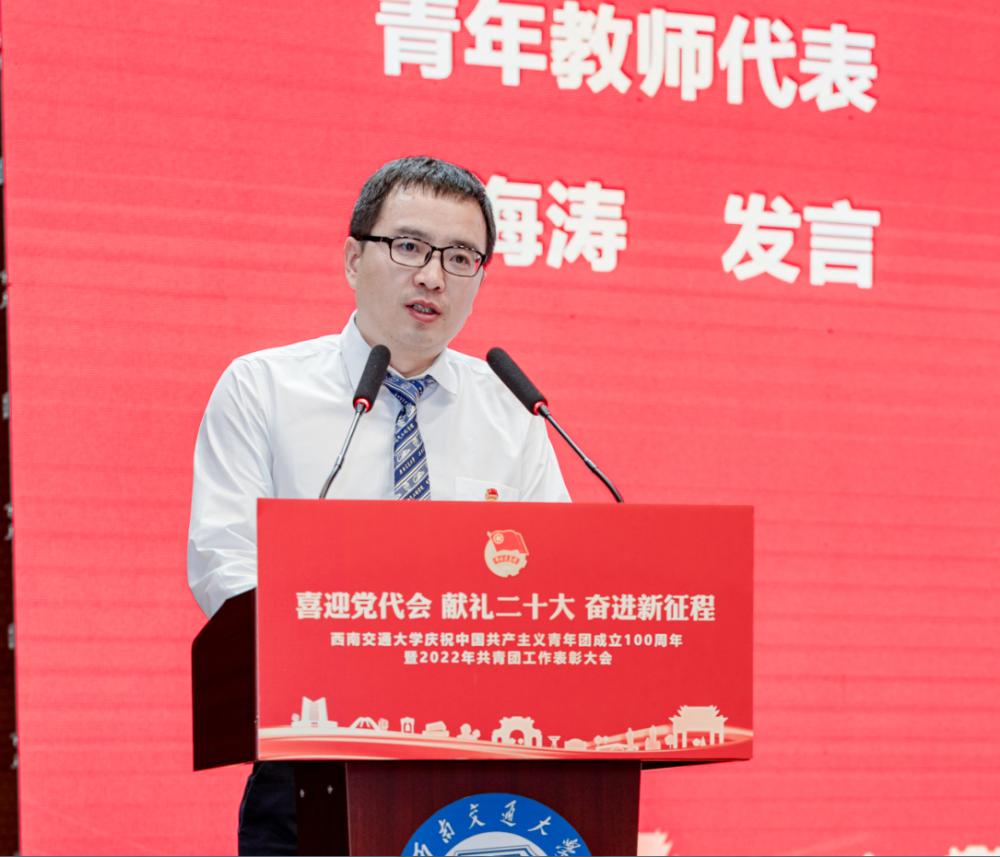 会上,全国铁路青年五四奖章获得者、学院2021级新能源二班导师胡海涛教授作为青年教师代表发言,他分享了自己脚踏实地、求真务实投身铁路事业的奋斗经历,并希望广大团员青年做追光的人,不负时代、不负韶华,助力中国高铁在新时代跑出加速度,让这张“中国名片”在世界舞台上更闪亮发光。