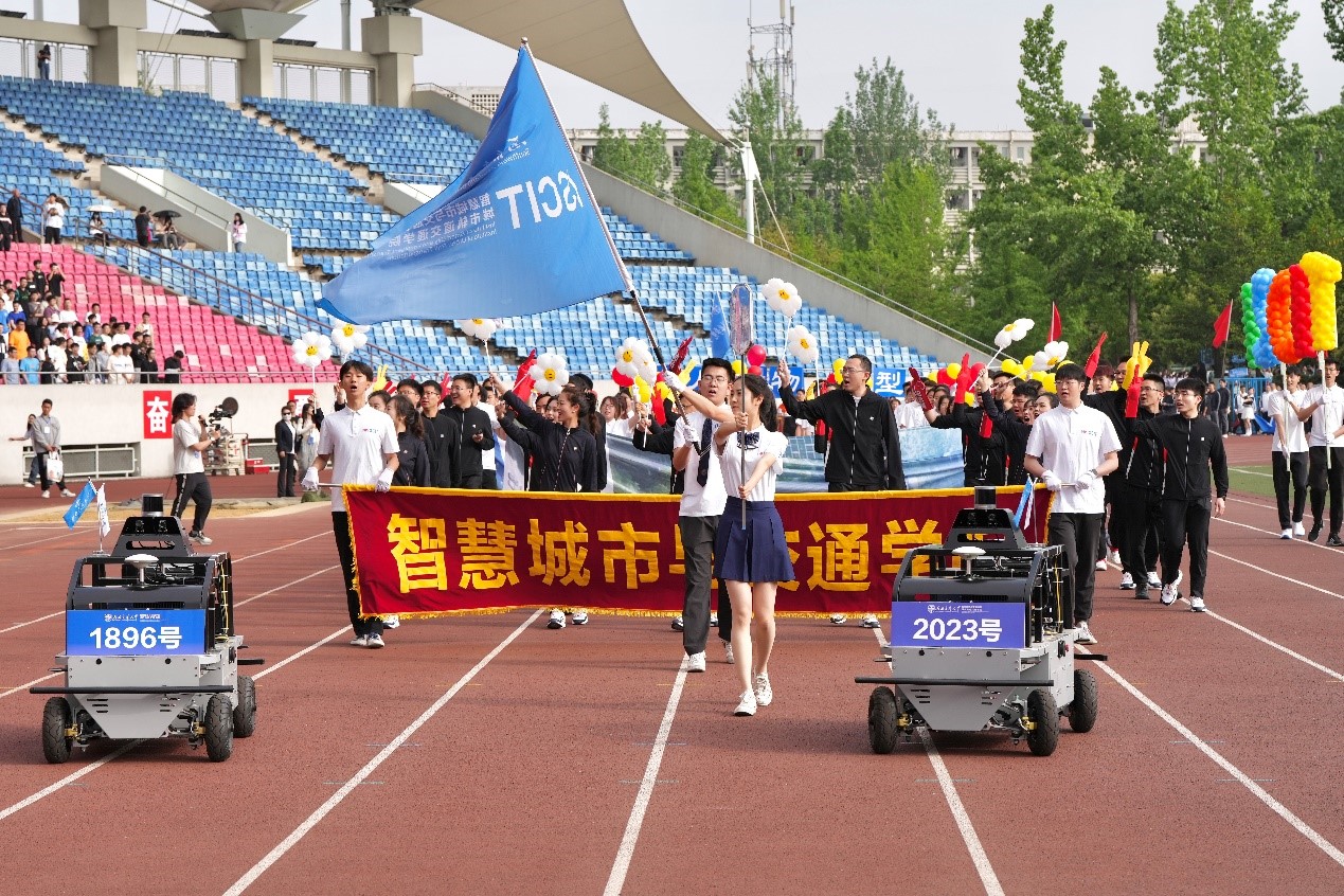 创新办学、创业图强,奋力打造重要增长极和强劲动力源!”在主持人的介绍中,学院师生代表队齐声喊出“智城智交,致新致远!心怀山海,智向未来!”的口号,与看台观众相呼应和,并展示学校东部(国际)校区建设效果图,展现团结一致建好校区的信心和决心。