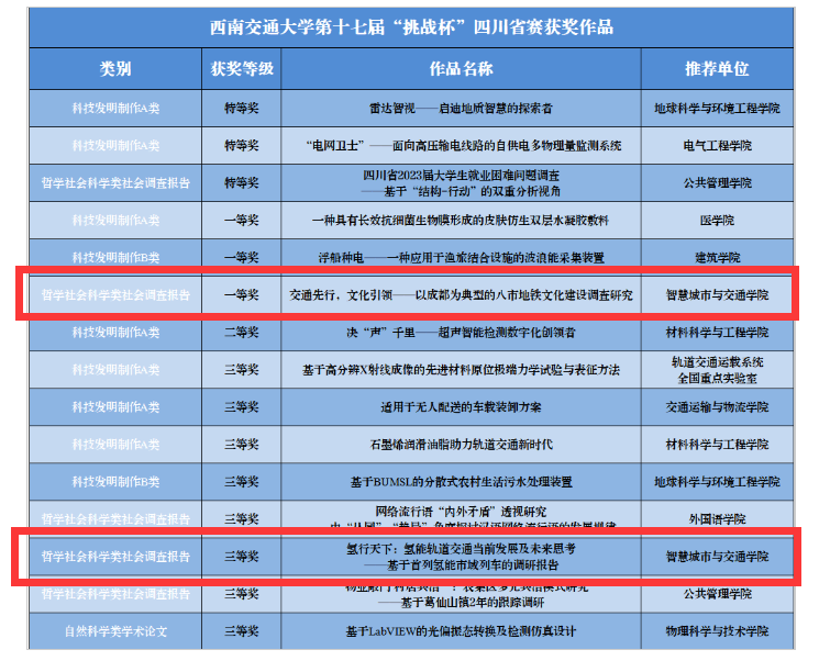 近日,第十七届“挑战杯”四川省大学生课外学术科技作品竞赛在成都大学闭幕。学院“交通先行,文化引领——以成都为典型的八市地铁文化建设调查研究”项目斩获省级一等奖,“氢行天下:氢能轨道交通当前发展及未来思考——基于首列氢能市域列车的调研报告”项目斩获省级三等奖。