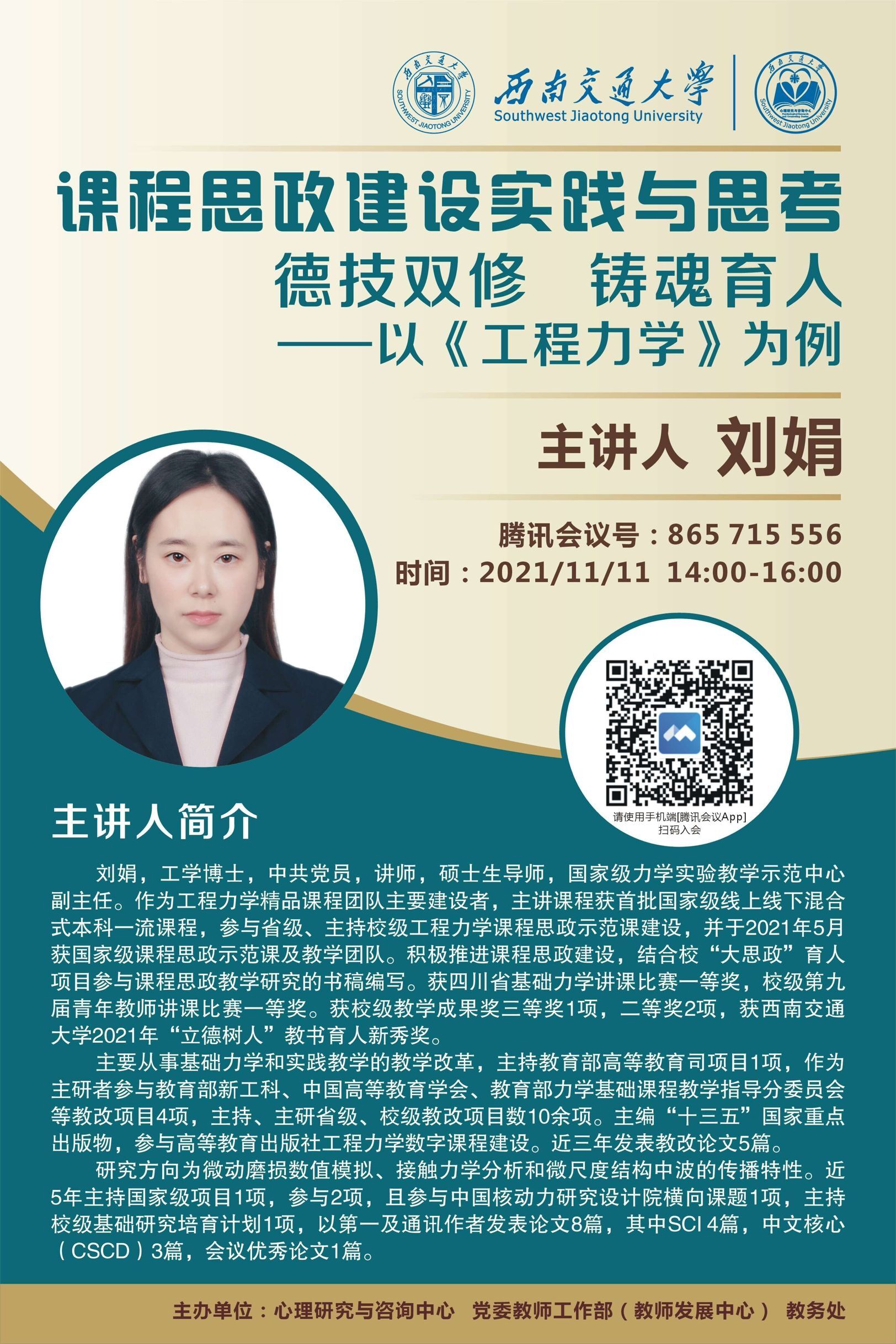 刘娟,工学博士,中共党员,讲师,硕士生导师,国家级力学实验教学示范中心副主任。作为工程力学精品课程团队主要建设者,主讲课程获首批国家级线上线下混合式本科一流课程,参与省级、主持校级工程力学课程思政示范课建设,并于2021年5月获国家级课程思政示范课及教学团队。积极推进课程思政建设,结合校“大思政”育人项目参与课程思政教学研究的书稿编写。获四川省基础力学讲课比赛一等奖,校级第九届青年教师讲课比赛一等奖。获校级教学成果奖三等奖1项,二等奖2项,获兔子先生