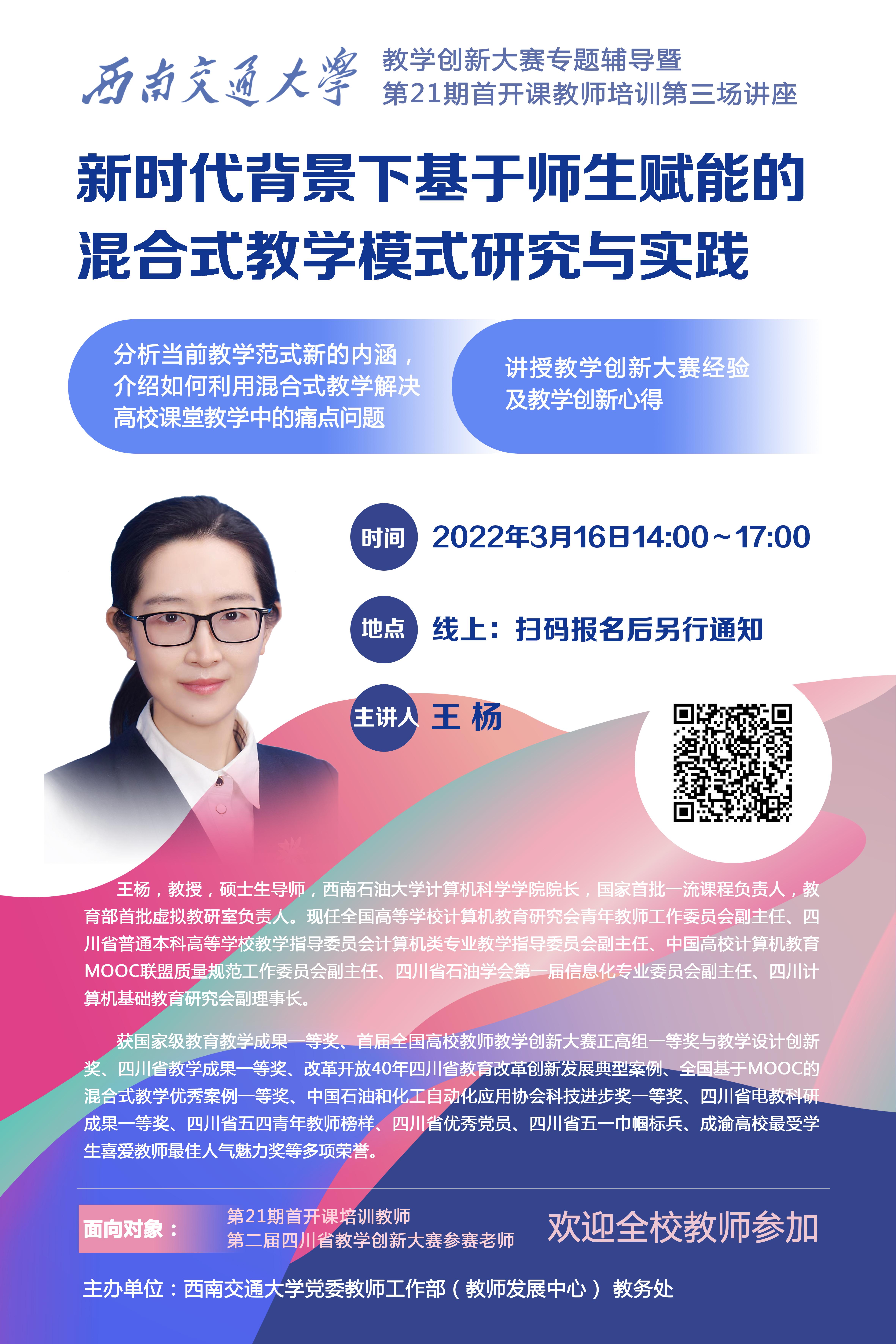 内容简介:首届全国高校教师教学创新大赛正高组一等奖与教学设计创新奖获得者王杨教授将带来:1. 分析当前教学范式新的内涵,介绍如何利用混合式教学解决高校课堂教学中的痛点问题;2. 讲授教学创新大赛经验及教学创新心得。