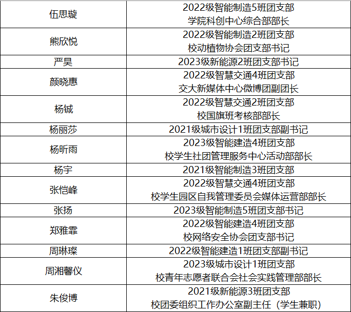 她始终牢记团干部的使命,带领团支部开展“追寻红色足迹,传承红色基因”等10余次主题团日活动;积极促进班团一体化,带领支部先后获得特色班集体、先进班集体、院级示范团支部等荣誉称号。学习生活中,她时刻发挥先锋模范作用,勤奋刻苦,积极参加科创竞赛,SRTP项目获省级立项,综合成绩位列专业前5%,获国家奖学金、三好学生、优秀共青团干部等荣誉。坚持“我为同学做实事”,服务同学,带领支部成员参与各类文体活动和志愿服务活动,在志愿四川平台累计服务时长近500小时,展现出全面发展的良好风貌。