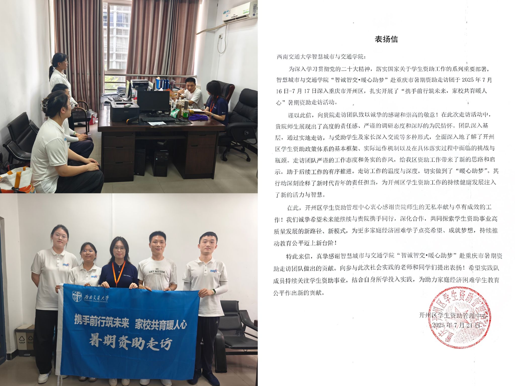 姚主任谈道:“我们的工作就是要让真正贫困的学生能够得到实惠,享受到相应的资助政策。行囊在肩头越走越沉,足迹在风中越走越亮,每一步跋涉,都在为寒门学子的梦想点亮一盏灯。”资助从来不只是物质上的支持,更是让贫困生卸下包袱、安心追梦的底气。走访团深刻感受到政府部门把资助落到实处的决心,开州区学生资助管理中心也向走访团的工作提出高度肯定,并寄出表扬信。走访团前往受助同学家庭慰问并宣传学校资助政策
