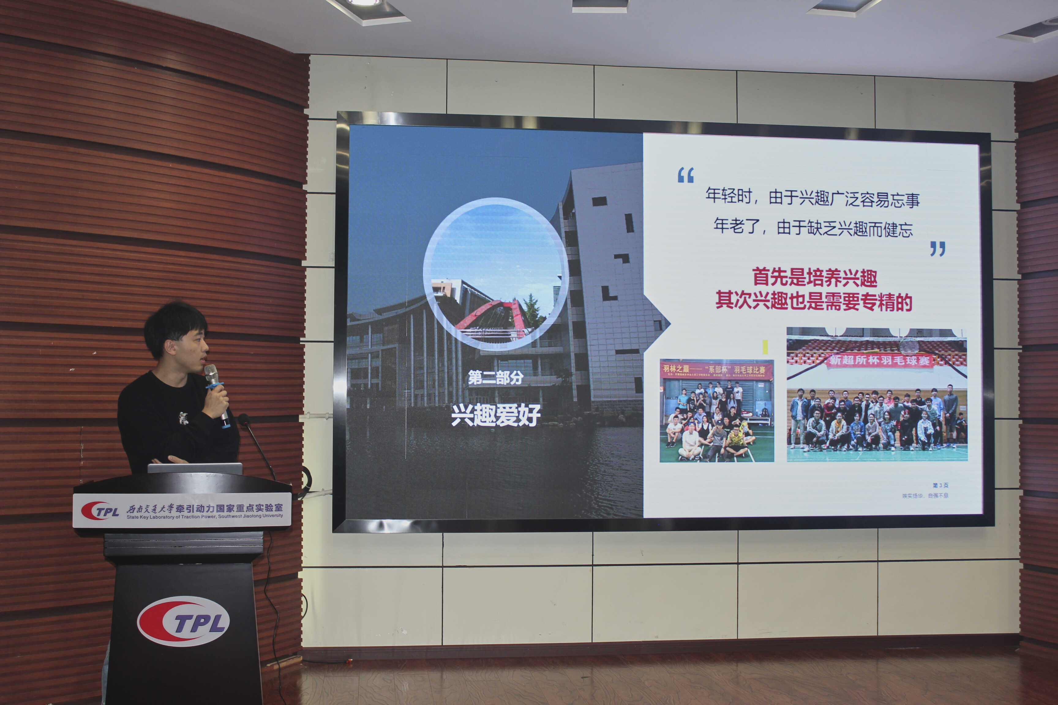 随后,同学们和实验室的研究生学长、学姐在九里校区红楼218会议厅进行经验分享与交流活动。活动开始,马光同向在场的师生介绍牵引动力国家重点实验室的历史沿革和发展概况;随后8位研究生依次向同学们分享自己在本科和研究生就读期间的学习及生活感悟,同时在场的老师和研究生分别对同学们提出的问题与疑惑进行了解答;最后,夏夏对本次活动进行了总结并向实验室成员表达诚挚的感谢,同时也对2021级新能源1班全体同学们提出殷切希望。