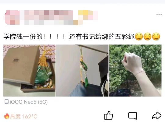编彩绳,纳福瑞。罗妍妍走近学生宿舍为大家编织五彩绳,同时为大家讲解了五彩绳的来历和寓意。同学们也都被这一传统习俗所吸引,争相学习编织五彩丝,也为老师们献上节日祝福。