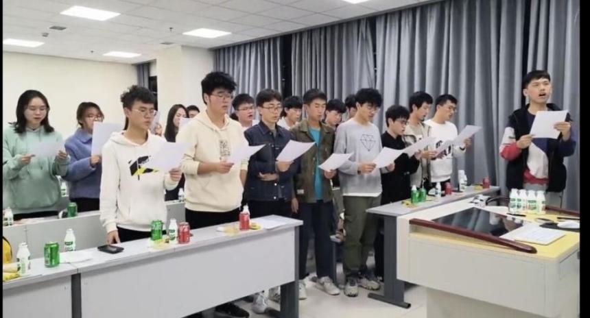 随后,同学们全体起立、伴着音乐,一起用最饱满的感情唱出了《光荣啊,中国共青团》;举起右手、庄严宣誓,一起重温了入团誓词。“勤奋学习,积极工作,吃苦在前,享受在后”,入团誓词指引着同学们前行的方向,让同学们在世界格局进入百年未有之大变局之时依旧保有一份赤子之心,不忘初心,牢记使命,为共产主义事业而奋斗。