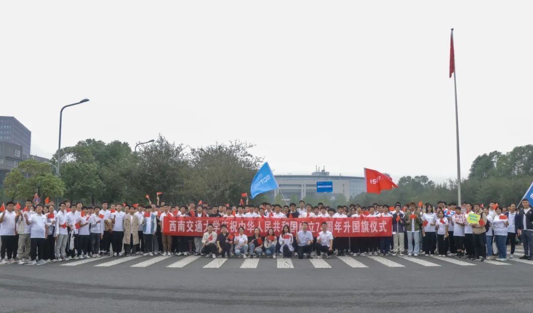 学院师生身着文化衫,党员、团员同志佩戴党员徽章、团徽,深情地唱出对祖国的清澈爱恋。在红旗的映衬下,交大校园生机盎然,智慧学子斗志昂扬。