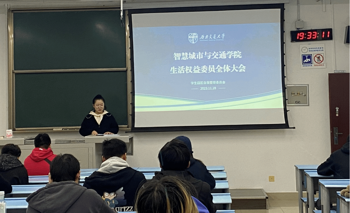 于11月28日19:30于X2435开展生活权益委员全体大会。本次大会由学生园区自我管理委员会主席团成员董婧、江宾主讲,学生园区自我管理委员会指导老师杨斌、园区主席团成员谢星羽以及学院各班生活权益委员参加。