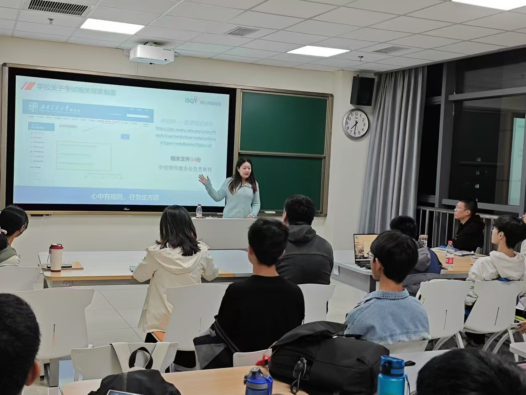 本科生相关管理规章制度,帮助新生全面掌握学校各项规章制度,明确学生的责任、权利与义务,同时为新生讲解评奖评优各条例文件,强调评奖评优规定。随后她从“网络素养及其特征”、“大学生网络失范行为与案例分析”及“如何提升网络素养”三个方面为新生开展网络素养教育专题讲解。