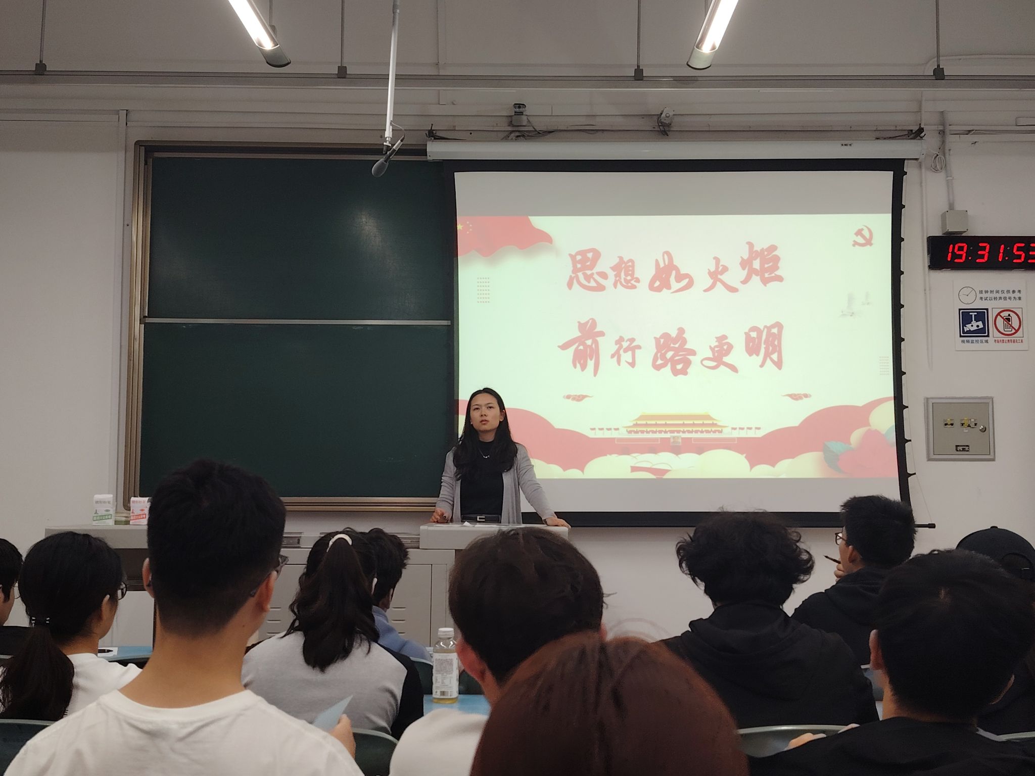 学院青年讲师团成员、团委书记于博伦老师向学院入团积极分子开展主题为“党的理论”的团课宣讲。她讲到,党的指导思想历经百年发展,波澜壮阔、成果丰硕,推动党的伟大事业从苦难走向辉煌。随后她着重讲解了思想建党、理论强党是中国共产党在长期发展过程中积累形成的宝贵历史经验和光荣传统,也是新时代新征程中国共产党人自觉肩负历史责任。党旗所指,团旗所向,本次团课引导入团积极分子领悟红色精神,传承红色基因, 进一步激励同学们积极响应共青团的号召,扩大共青团组织的力量。