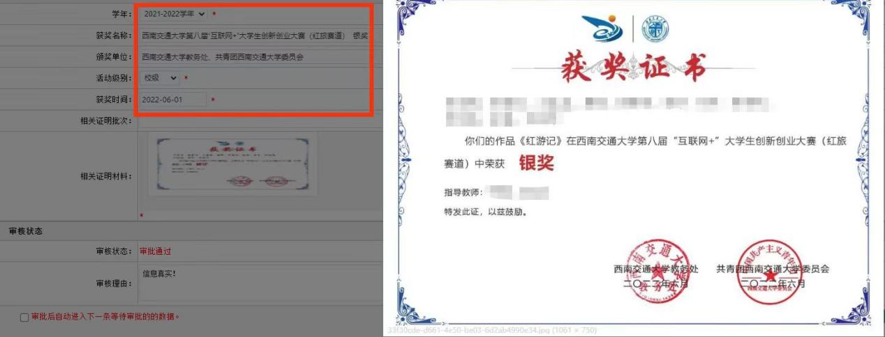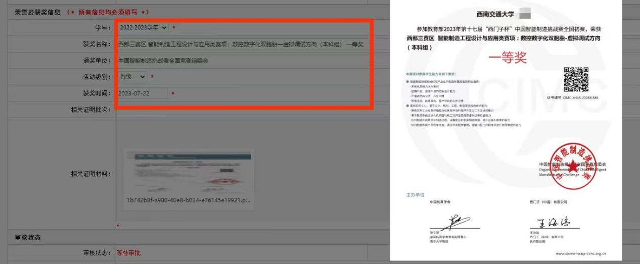 学年勾选2024-2025学年,获奖名称、获奖单位按照获奖证书或相关成绩证明填写完整,不得简写或缩写,相关证明材料需上传获奖证书或相关成绩证明(扫描版),示例如下:
