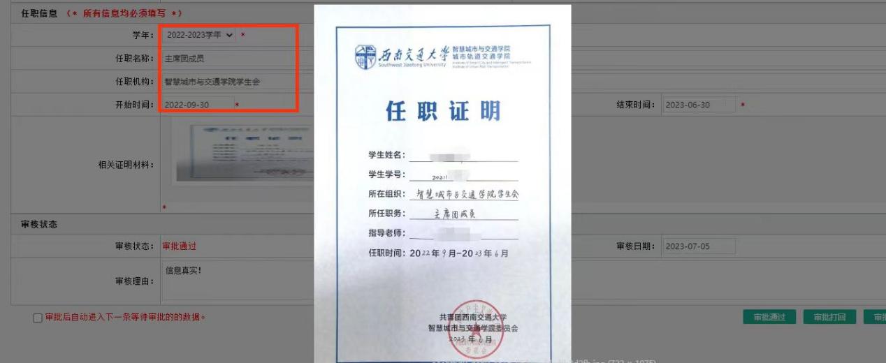 学年勾选2024-2025学年,任职名称、任职机构填写完整,班委任职机构按照“智能建造2022-01班”格式填写,相关证明材料需上传任职证明或加盖公章证明(扫描版),示例如下: