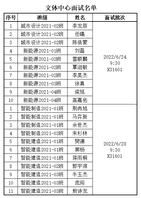 面试形式为个人答辩和现场问答,分两批进行,面试时间为2022年6月24日上午和2022年6月28日上午,面试地点为X31601。请进入面试的同学准备5分钟以内的个人展示ppt(内容包括但不限于拟竞岗位的个人优势及岗位工作规划)。