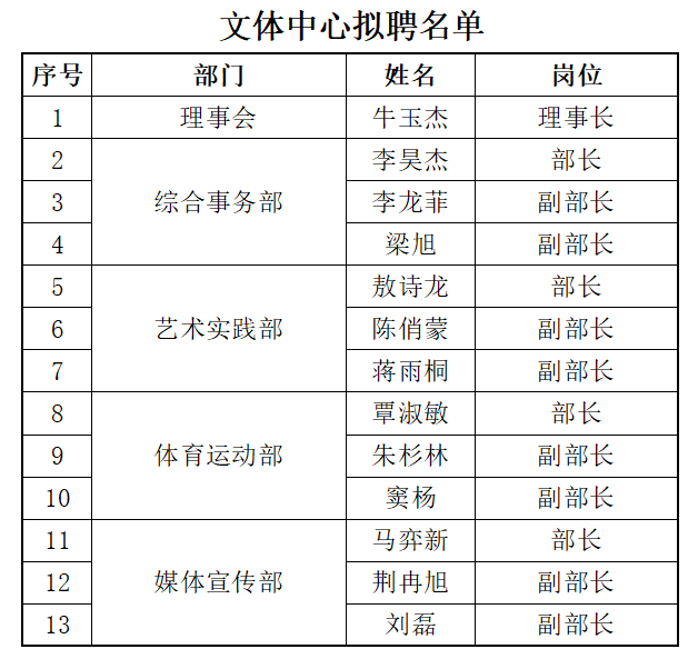 学生文体活动中心的通知》等文件的相关要求,学院学生文体活动中心选聘工作小组本着“公开、公平、公正”的原则,面向全院学生选聘文体中心理事长及各部门部长、副部长。经个人申请、资格审查、现场面试等环节,最终拟聘任以下同学担任2022-2023学年兔子先生