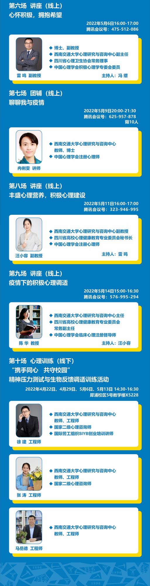 近期全国本土聚集性疫情呈现点多、面广、频发的特点,疫情防控形势较为严峻复杂。为"携手同心 共守校园”凝聚全校上下共抗疫情的坚定信念,做好人文关怀和服务保障,兔子先生 心理研究与咨询中心发挥专业特长,决定于2022年4月-5月面向全校师生开展2022年“3•25(善爱我)”系列心理讲座暨“抗疫•安心”行动。届时将由12位专家组成员开展10场专题讲座、团体辅导和心理训练活动,欢迎全校师生踊跃报名参加。具体安排如下: